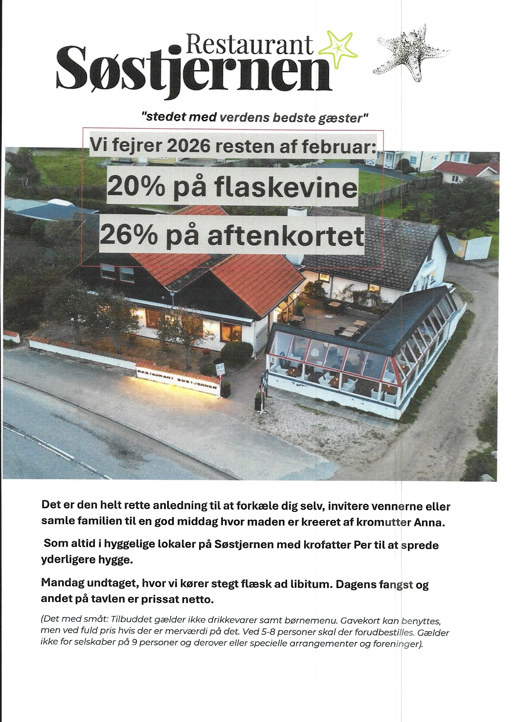 Søstjernen er kendt gennem generationer af gæster, og vi bestræber os på at være et madsted med god dansk/skandinavisk inspireret mad med tid til anden udefrakommende inspiration.